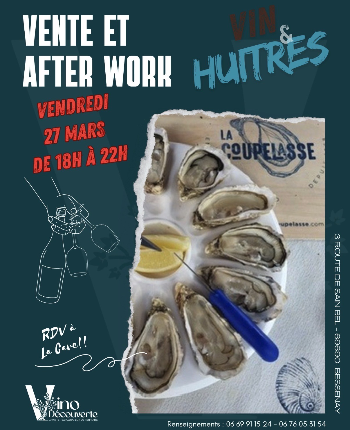 Afterwork vendredi 27 mars de 18h à 22h à la Cave Vino Découverte à Bessenay, avec les huîtres de la Coupelasse + planche apéro.