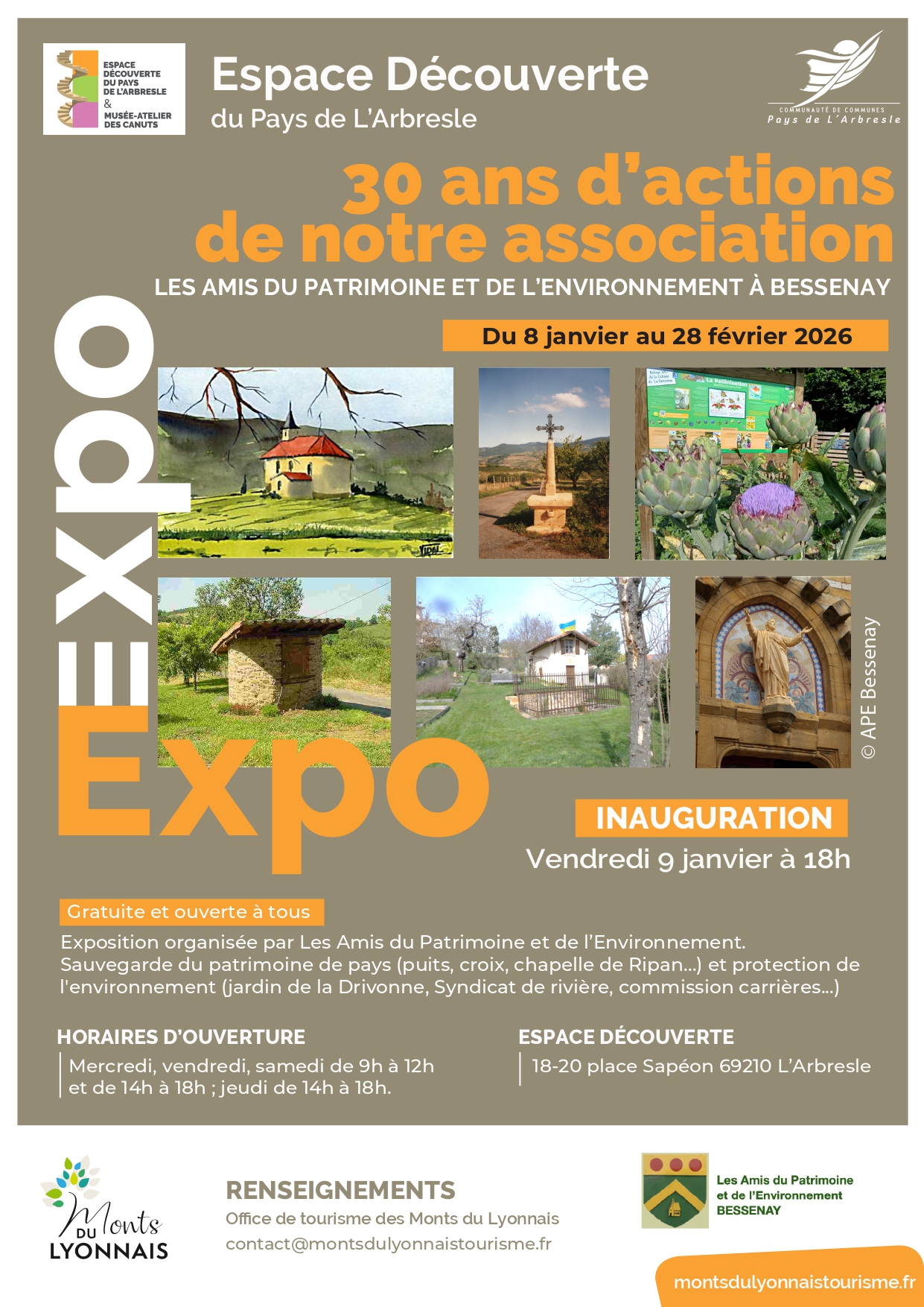 L’exposition présente les activités de sauvegarde du patrimoine de pays (puits, croix, chapelle de Ripan…) et de protection de l’environnement (jardin de la Drivonne, rivières, carrières…) des Amis du Patrimoine et de l’Environnement de Bessenay.